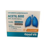 O Acetil 600 da Good Vit é um suplemento alimentar em pó formulado com NAC (N-Acetilcisteína), uma substância reconhecida por sua ação antioxidante e por auxiliar na saúde respiratória. Cada sachê contém 600mg de NAC, sendo ideal para o uso diário de adultos que desejam fortalecer os pulmões, auxiliar na eliminação de muco e reforçar as defesas naturais do organismo. Sua fórmula sem adição de açúcares, com sabor laranja agradável, é prática e fácil de consumir. A embalagem contém 16 sachês de 3g cada, totalizando 48g de produto. Ideal para quem busca bem-estar respiratório, prevenção de doenças respiratórias e suporte antioxidante em uma rotina prática e saborosa.