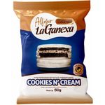 Pasta de amendoim sabor cookies and cream la ganexa, gordura vegetal, farinha de arroz, amido de mandioca, leite desnatado em pó, polidextrose, matitol, cacau em pó, soro de leite em pó, gotas de biscoitos zero açucares, sal , aromatizante , emulsificantes lecitina de soja e polirricinoleato de poliglicerol, estabilizante goma xantana e edulcorante stevia.