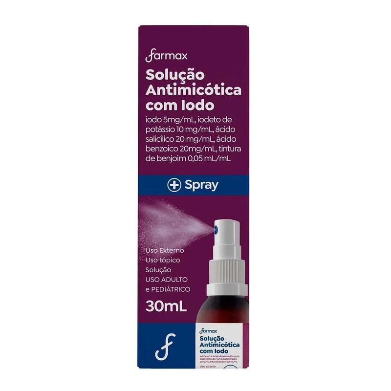 O que é? O Farmax Spray é um antimicótico com iodo que auxilia a proteger e evitar doenças de pele. Para que serve a solução Antimicótica com iodo? O antimicótico ajuda a combater e prevenir micoses, que são infecções causadas por fungos, na região das unhas das mãos e dos pés. Como usar a solução Antimicótica? Aplicar 2 a 3 vezes ao dia Quais os benefícios do antimicótico com iodo farmax solução tópica spray 30ml? Ajuda no tratamento contra fungos Restabelece a aparência natural das unhas Diminui e controla o odor causada pelas infecções Advertências Manter fora do alcance de crianças Alérgicos aos componentes da fórmula, procura orientação médica Uso adulto e pediátrico Composição Ácido Benzoico Ácido Salicílico Iodo Metálico