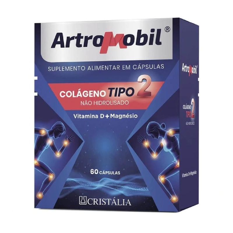Artromobil Colágeno Não Hidrolisado Tipo 2 com 60 Cápsulas - Ajuda a combater e prevenir as dores nas articulações - Potencializa a eficiência dos cuidados com a fragilidade óssea - Auxilia na reposição do colágeno - Favorece a reconstrução das cartilagens - Proporciona mais força muscular.