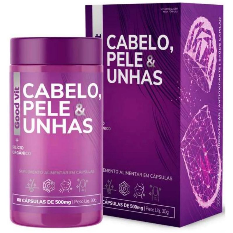 O Cabelo, Pele & Unhas Good Vit é um suplemento alimentar em cápsulas formulado para promover beleza e saúde de dentro para fora. Cada unidade contém 60 cápsulas de 500mg, desenvolvidas para auxiliar na manutenção da firmeza e tonicidade da pele, fortalecer unhas e cabelos e estimular a síntese natural de colágeno e elastina. Sua composição reúne nutrientes essenciais como o zinco, que contribui para o funcionamento adequado do sistema imunológico e para a manutenção do cabelo, da pele e das unhas, o cromo, que auxilia no metabolismo de proteínas, carboidratos e gorduras, e a biotina, importante para a saúde da pele, do cabelo e das mucosas. O suplemento é produzido em laboratório farmacêutico regularizado pela ANVISA, não contém glúten, não engorda, possui zero açúcar e zero calorias. O consumo recomendado é de uma cápsula ao dia, conforme orientação de ingestão diária constante na embalagem.
