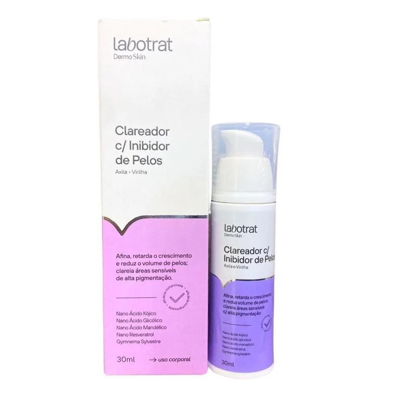 O sérum clareador com inibidor de pelos, da Labotrat Dermo Skin, afina, retarda o crescimento e reduz volume de pelos, além de clarear áreas sensíveis, como as axilias e virilha, com alta pigmentação. Sua fórmula é enriquecida com Nano Ácido Kójico, Nano Ácido Glicólico, Nano Ácido Mandélico, Nano Resveratrol e Gymnema Sylvestre, que vão ajudar a trazer o melhor resultado às áreas de aplicação.