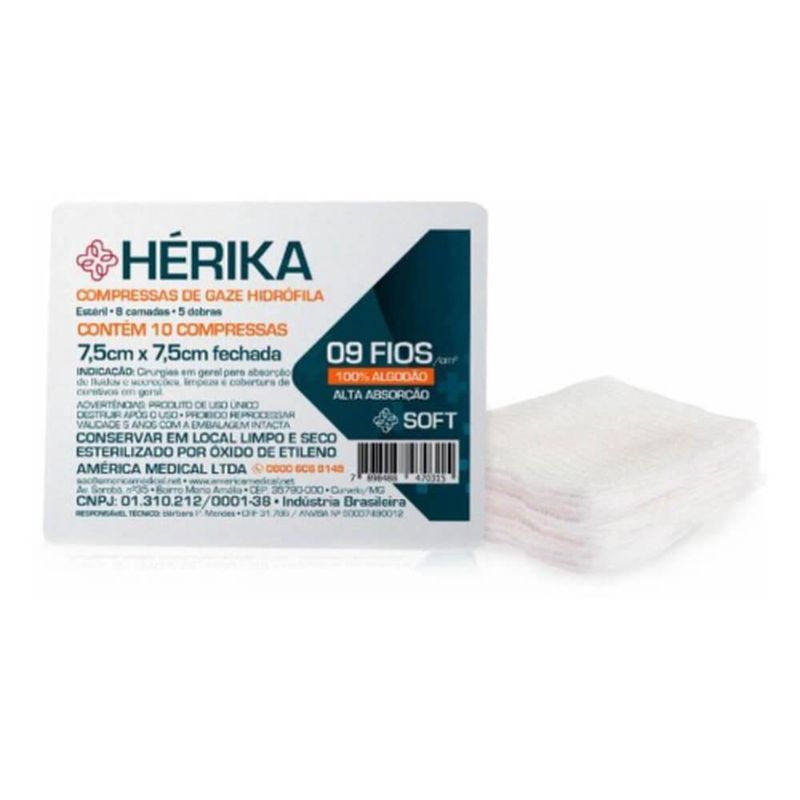 Compressa de gaze estéril hérika infecção, impurezas e germes aqui não por ser fabricada com a mais alta qualidade, a compressa de gaze estéril hérika não possui substâncias gordurosas, corantes corretivos, amido, alvejantes ópticos e impurezas em geral. Isso é benéfico aos usuário, pois não há riscos de infecções hospitalares ou qualquer outra contaminação. A compressa de gaze é ideal para a limpeza de ferimentos, curativos, absorção de sangue ou outras secreções em cirurgias. Além disso, é indicada para esterilização a gás óxido de etileno, autoclave ou raios gama. Uso em cirurgias e curativos. 5 Dobras e 8 camadas. 100% Algodão. Alta absorção. Disponível em embalagem com 10 unidades. Advertências não ingerir; armazene em local seco e fresco; descartar corretamente após o uso; produto de uso único; mantenha fora do alcance de crianças e animais. Composição 100% algodão. Medidas aproximadas do produto comprimento: 10 cm altura: 1 cm largura: 13 cm peso: 1 g