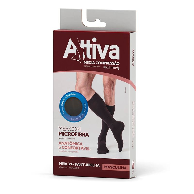 A meia de média compressão 3/4 Attiva é um produto terapêutico, produzido com avançada tecnologia, que exerce compressão graduada em todo membro inferior. A terapia de compressão ajuda a circulação sanguínea, diminuindo o diâmetro da veia dilatada e auxiliando no retorno venoso, o que diminui as dores, inchaço e sensação de pernas cansadas. A compressão graduada exerce 100% de sua compressão no tornozelo, diminuindo gradualmente, fazendo com que a eficiência e eficácia da meia seja aumentada. Consultar disponibilidade de cor. (Imagem meramente ilustrativa)