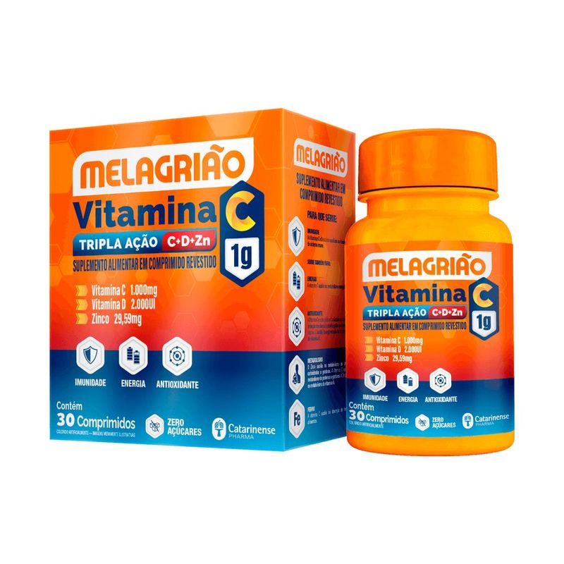 Melagrião Vitamina C foi desenvolvido com base nas necessidades nutricionais específicas. Possui em sua formulação 3 nutrientes (2 vitaminas + 1 mineral): Vitamina C 1.000 mg + Vitamina D 2.000 UI + Zinco 29,59 mg. Para que serve Melagrião possui nutrientes que auxiliam no funcionamento do sistema imune. Modo de usar Recomenda-se ingerir 1 comprimido ao dia. Deve ser ingerido com líquido, preferencialmente antes de uma das refeições. Suplemento alimentar com 3 nutrientesCatarinense Nutrição é uma linha de suplementos alimentares desenvolvida com a finalidade de oferecer fórmulas balanceadas. Sua composição de vitaminas e minerais foi cuidadosamente selecionada e os produtos da linha são isentos de açúcares, gorduras totais, valor energético, lactose e glúten.