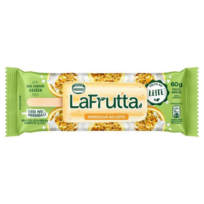 A Frutta é uma das mais tradicionais e conhecidas marcas de Sorvetes Nestlé e oferece o sabor da fruta de verdade, além disso, ele é muito refrescante, ou seja, ideal para os dias de calor. O Picolé Maracujá ao Leite La Frutta 60g é a perfeita opção para quem gosta de sorvete de fruta, sem glúten, prático e ótimo para qualquer clima ou estação do ano.