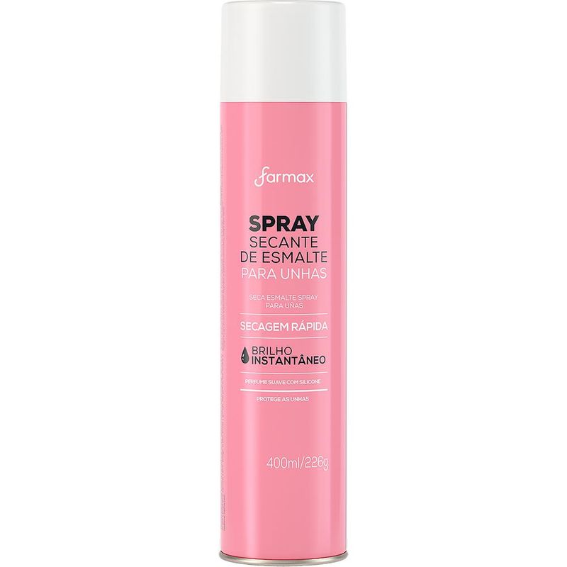 O Spray Secante de Esmalte Farmax possui fórmula enriquecida com silicone, proporcionando brilho, secagem rápida e proteção aos esmaltes, evitando a formação de bolhas e borrões indesejados que habitualmente ocorrem com os esmaltes ainda úmidos.