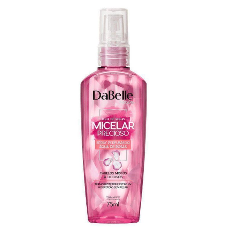 Dabelle spray perfumado água de rosas micelar precioso 75mlo spray perfumado micelar tem textura super leve e fluida, ajuda a suavizar o ressecamento, condicionar, além de proteger contra agressões diárias e calor de secador e chapinha. também adiciona uma dose extra de brilho e deixa os cabelos delicadamente perfumados. contém filtro uv e proteção térmica. tratamento precioso: água de rosas: tem poder hidratante e antioxidante, cuida das áreas mais sensíveis dos fios oleosos a mistos, as pontas. água micelar: purifica os fios sem agredir ou ressecar os cabelos. sugestão de uso:borrife diretamente nos cabelos úmidos ou secos a quantidade desejada, use as mãos, pente, escova ou chapinha para finalizar.
